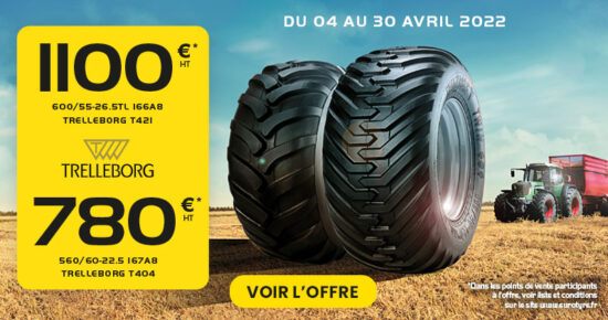Du 04 Avril au 30 avril 2022, profitez du pneu Agricole Trelleborg T404 600/55-26.5 à 780€ HT* et T421 600/55-26.5 […]